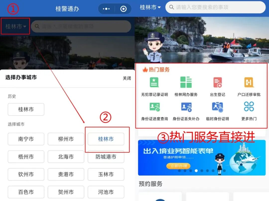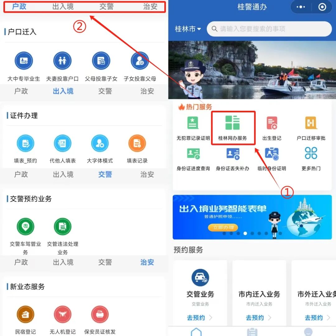 选择“热门服务”中的“桂林网办服务”,内有户政、出入境、交警、治安等多种业务,几乎可以满足您的全部需求。