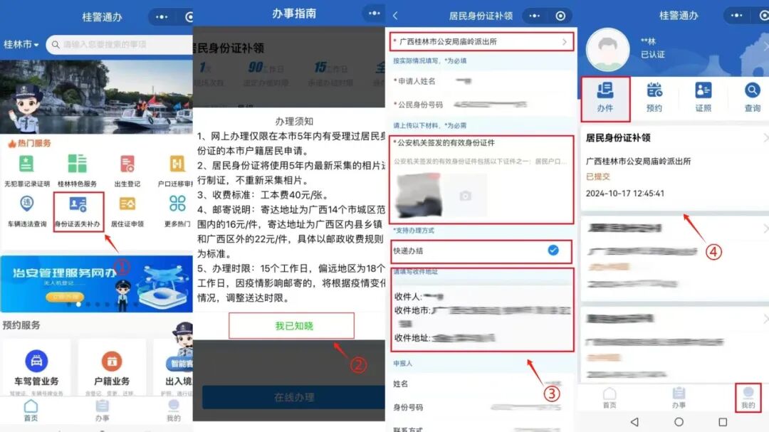 如果您的身份证不慎丢失,只需按照下图操作,选择“身份证丢失补办”,按照操作指引逐一填写信息、上传相关材料,记得勾选“快递办结”,就能在家坐等证件上门!另外,还能在“我的”界面实时查看办理进度。