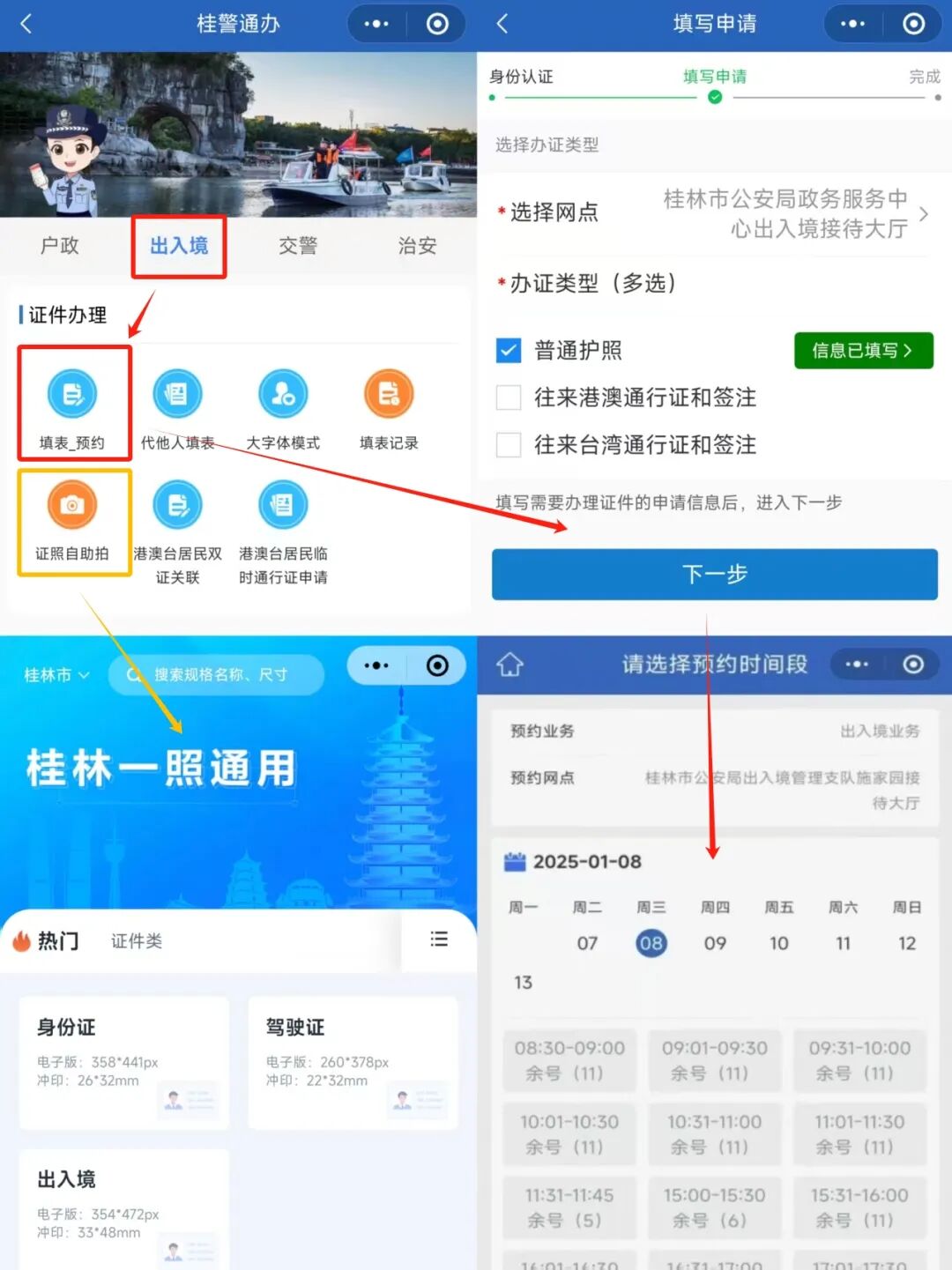 如果您想办理护照等出入境证件,以往要到大厅手写填表再排队办理。现在只需按照下图操作,就能在线填表+预约,到大厅即办即走,还能使用“证照自助拍”小程序自拍满意证件照,更省时省心!