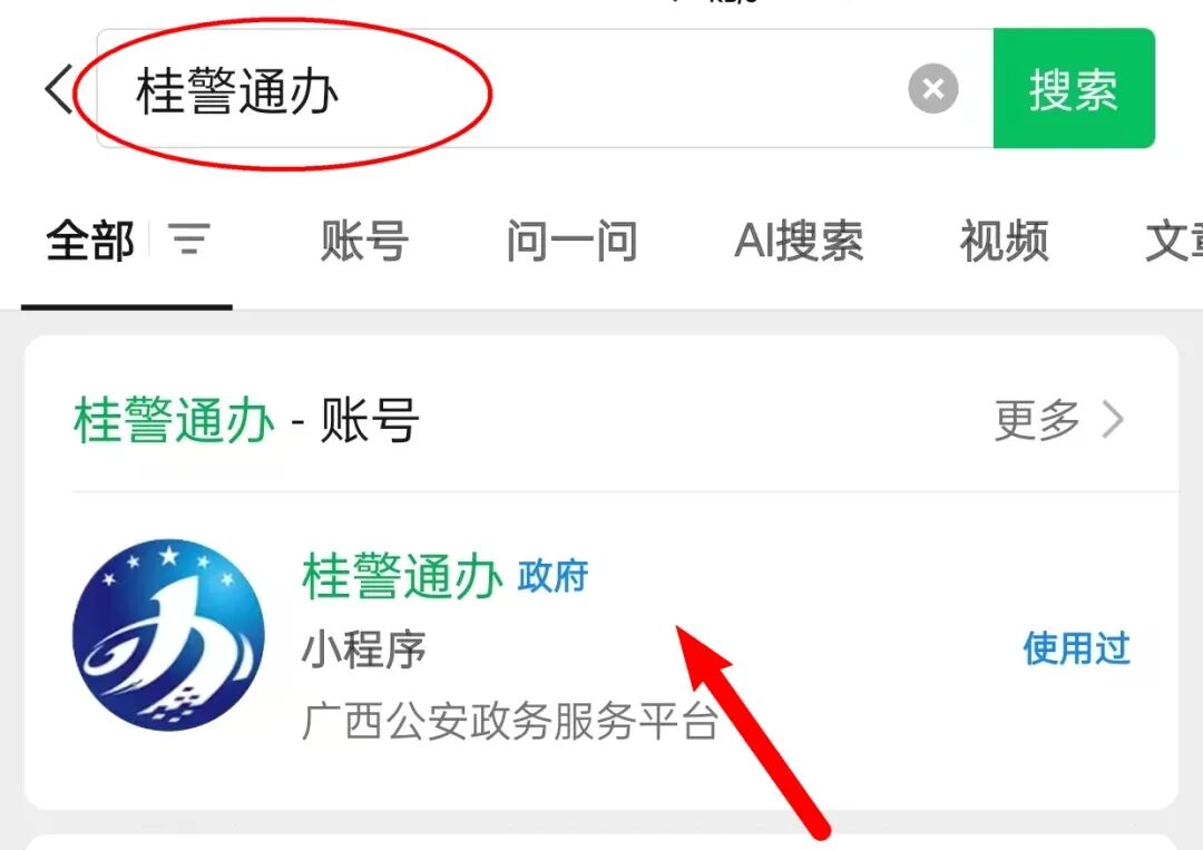 打开微信,搜索“桂警通办”小程序,轻松一点即可进入。也可以识别此处二维码快速跳转。